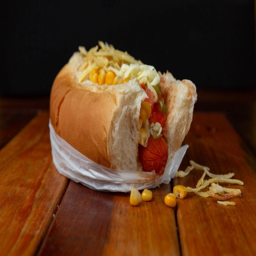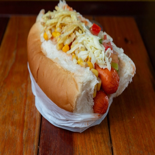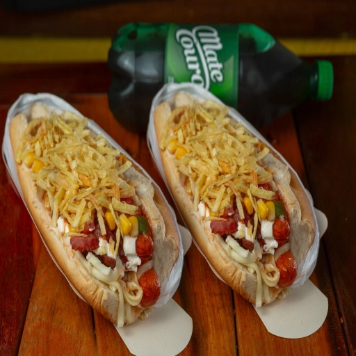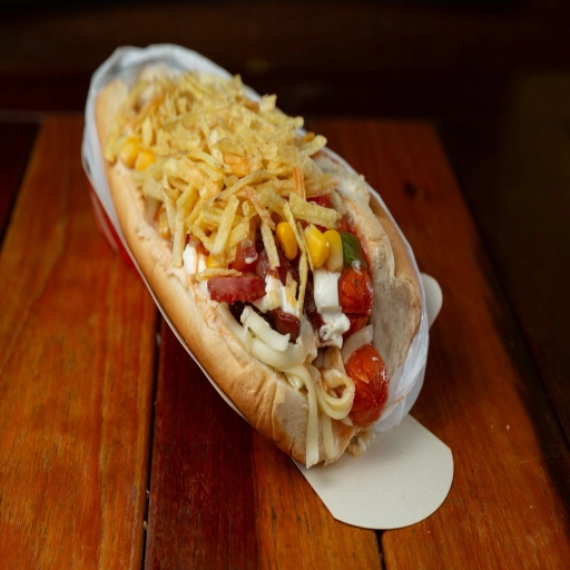 pão 80gr, 2 salsichas, mussarela, bacon, catupiry, 2 ovos de codorna, milho, vinagrete, passas, batata palha artesanal ... Ver completo