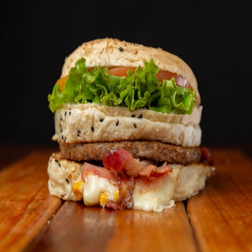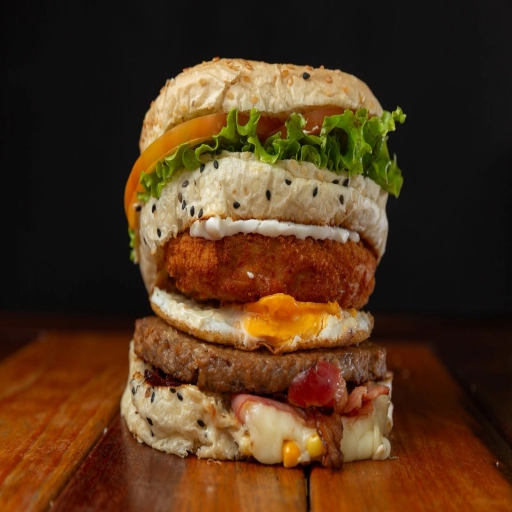 Pão, 2 carne sabor picanha 120g, ovo, bacon, mussarela, presunto, molho baconese, batata palha artesanal, milho, alface... Ver completo