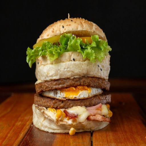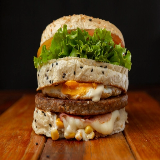 Pão, 2 carne sabor picanha 120g, ovo, bacon, mussarela, presunto, batata palha artesanal, molho baconese, milho, alface... Ver completo